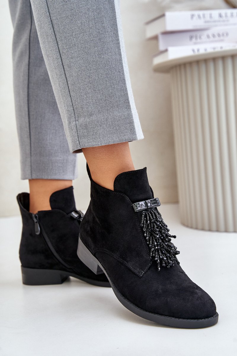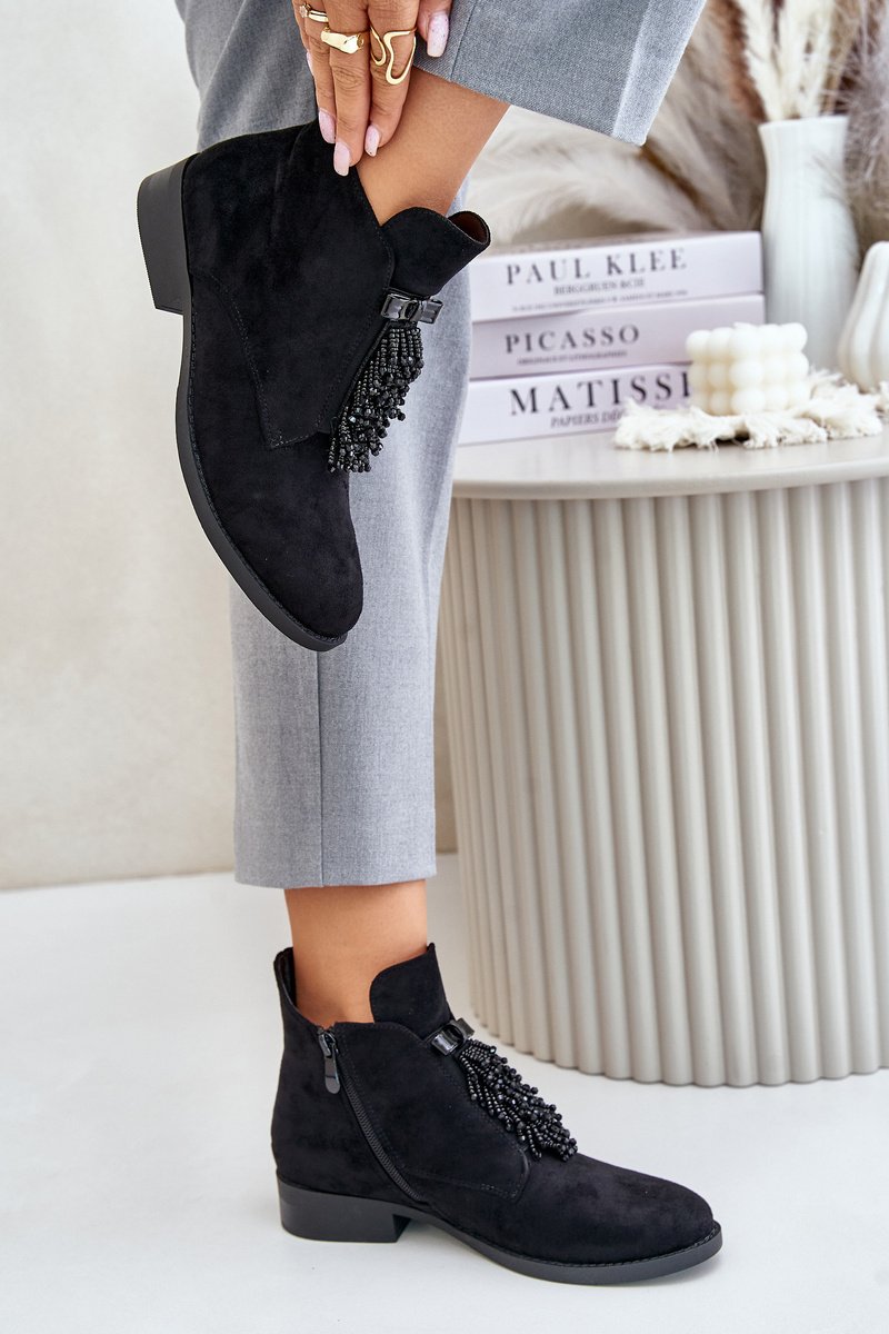 Moteriški botai iki čiurnos, prekės ženklo S.Barski. Pagaminti iš eko zomšos. Įtvirtinti ant plokščio kulno, kuris užtikrins stabilumą kiekviename žingsnyje. Suapvalinti noseliai. Pagrindinis šio modelio privalumas yra priekyje esanti puošmena, suteikianti ypatingo žavesio. Šis modelis turi apšildymą batu antklodės pavidalu. Pasirinkdami dydį, vadovaukitės dydžių lentelę.