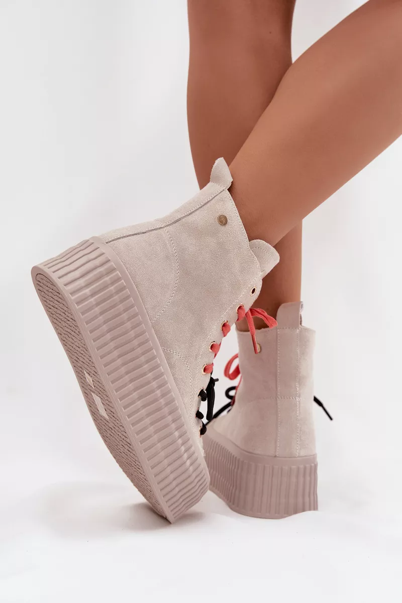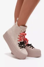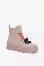 Šildytos moteriškos GOE firmos aulinukai yra stilinga avalynė, puikiai tinkanti vėsesnėmis dienomis. Pagaminti iš aukštos kokybės natūralaus zomšo, jie atrodo madingai ir prašmatniai, kartu garantuoja patvarumą ir dėvėjimo komfortą. Tvirtas padas suteikia aukščio ir pabrėžia modernų batų charakterį. Unikalią išvaizdą suteikia dvigubi, dviejų spalvų raišteliai, kurie yra originalus akcentas, traukiantis akį. Tai modelis, idealiai tinkantis moterims, vertinančioms patogumą, miesto stilių ir madingus akcentus kasdienėje aprangoje.