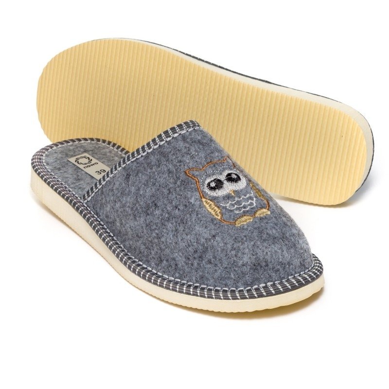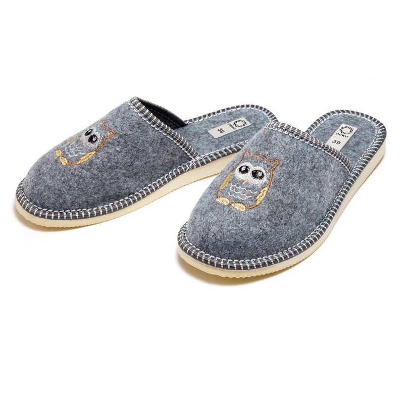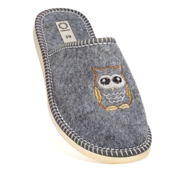 Šių šlepečių dizainas išskirtinis – pilkai mėlynas atspalvis puikiai dera su kontrastingu baltu krašteliu, o priekinę dalį puošia išsiuvinėta miela pelėda. Tai ne tik suteikia žaismingumo, bet ir išskiria šlepetes iš daugelio kitų modelių – jos tampa ne tik praktišku, bet ir estetišku pasirinkimu. Šlepetės turi tvirtą, bet elastingą guminį padą, kuris neslysta ir apsaugo nuo šalčio grindų paviršiuje. Dėl patogaus dizaino ir uždaro modelio, jos puikiai priglunda prie pėdos, suteikdamos stabilumo ir saugumo jausmą.