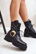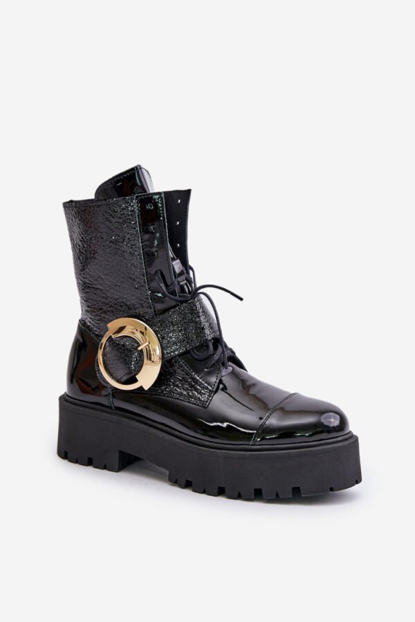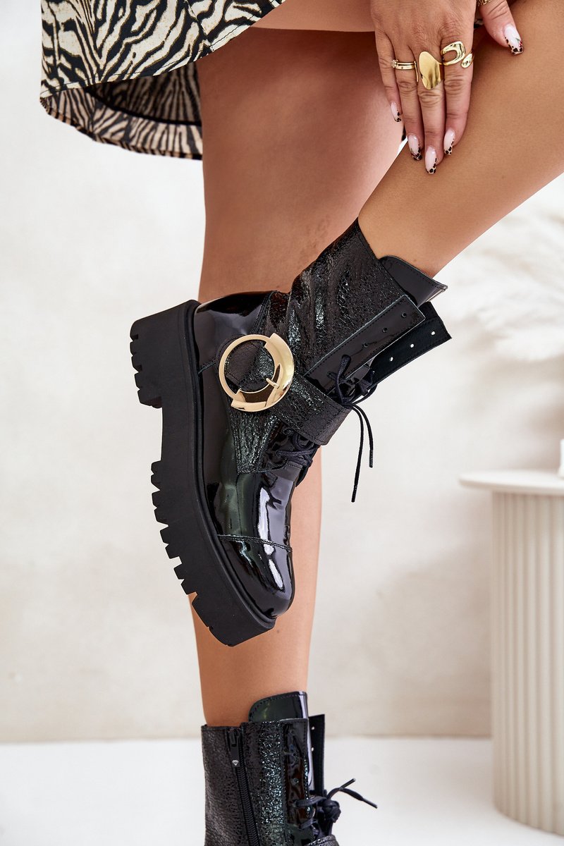 Išskirtiniai aulinukai, pagaminti iš natūralios odos. Platforma ir plokščias kulnas užtikrina stabilumą ir patogumą dėvint. Modelis užsegamas užtrauktuku, papildomai turi raištelius geresniam prigludimui. Didelė sagtis su dirželiu ant aulo yra efektingas akcentas, suteikiantis jiems madingą, išraiškingą charakterį. Renkantis dydį, vadovaukitės dydžių lentele.
