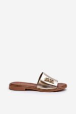 Elegantiškos natūralios odos moteriškos šlepetės. Įmontuotos ant plokščio kulno. Priekyje – auksinė puošmena. Dėl aukštos kokybės šios šlepetės taps nepakeičiama vasaros stiliaus dalimi! Renkantis dydį, prašome vadovautis dydžių lentele.
