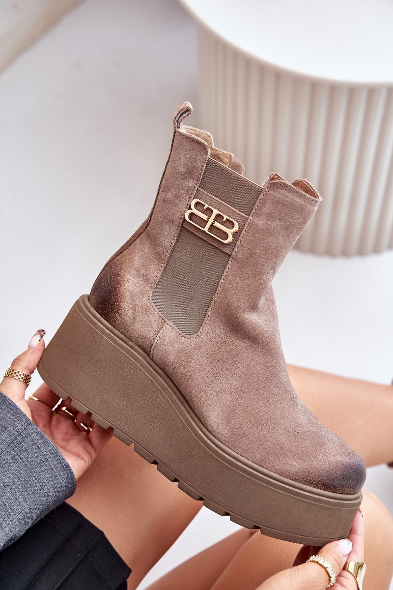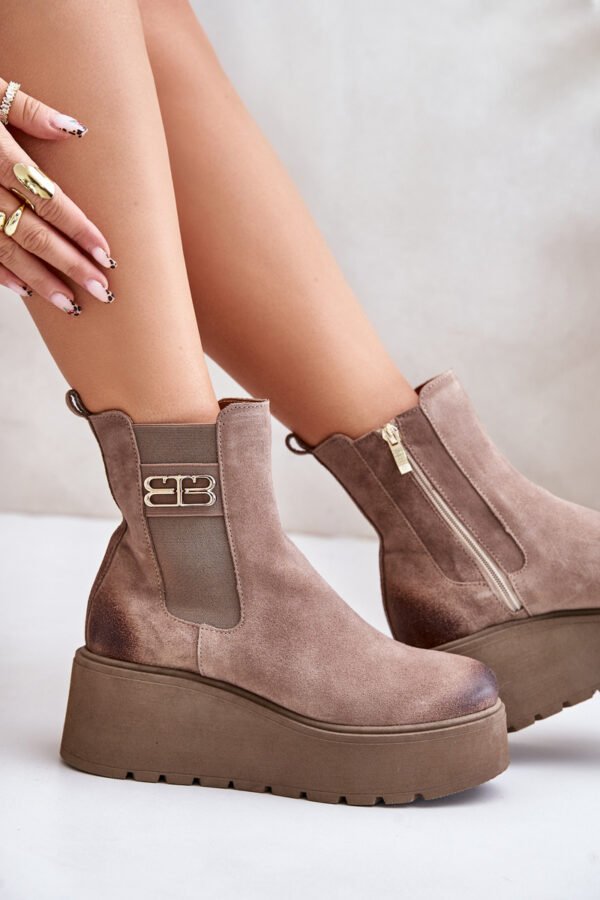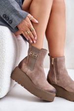 Moteriški aulinukai, pagaminti iš natūralaus zomšo, yra stilingas pasiūlymas vėsesnėms dienoms. Jie yra ant masyvios platformos su pleištu, užtikrinančiu komfortą ir stabilumą. Šoninis užtrauktukas ant aulo palengvina apsiavimą, o sutvirtintas kulnas suteikia batams ilgaamžiškumo ir atramos. Dėl veltiniu paminkštintos vidaus apdailos užtikrinama šiluma, o dekoratyvinis elementas ant aulo pabrėžia jų išskirtinį charakterį. Šis modelis puikiai papildys įvairias stilizacijas. Pasirinkdami dydį, vadovaukitės dydžių lentele